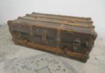 | Antique steamer trunk featuring a flat top and ornate hardware. |