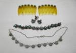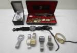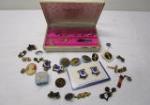 | Jewelry case with many collectible military pins including some US Army 181st Infantry Regiment crest pins, US Army field artillery collar pins, US Army Specialist pins and many more. These come in a vintage faux leather hinged jewelry case. |