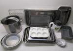 | Large lot of cook and bakeware including eight bread pans, muffin tins, cake pans, cookie sheets and more. |