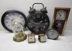 | Collection of seven wall and desk clocks including a large black Quartz alarm clock, a Split-second Precision wall clock, a Hermle West German moon phase glass dome mantel clock and more. |