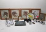 | Home Decor Lot with Horse Portraits, 3D Plaster Horse, Dachshund Planter, Homemade Bug Glasses and Others. |