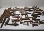 | Large lot of vintage wooden barrel spigots. This includes 20 complete spigots and 1 double tap spigot, plus parts for many others. Sizes range from 5" to 14 3/4". Some have manufacturers stamps on them. |