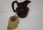 | Stunning, vintage 9-1/4" mottled glazed earthenware pitcher featuring a dog (hound)-shaped handle, made by A. Harker, Taylor Co. |