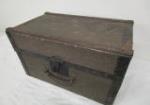 | Vintage wood and metal storage chest compartmentalized inside. |