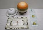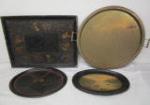 | Round multicolored candle on wooden base, Limoges butter dish with cover and floral design, three glass small square trays with Bee themes and tiled rectangle table tray. |