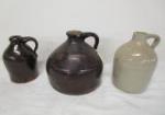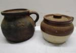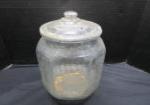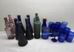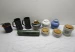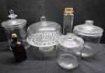 | Covered pedestal cake plate, three covered jars with glass covers, tall clear glass jar with cork stopper and smaller Amber bottle with cork stopper. |