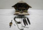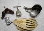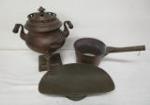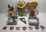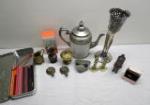 | Enameled Teapot with Pewter, Brass Mini pitcher, Vase, candlesticks and incense burner, Tall plated vase by Wilcox, Copper tone metal horse figurine, Interesting Turtle shape candle holders, Frog decor w/ marble eyes, metal hooks and tin of colored pencils. |