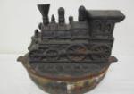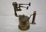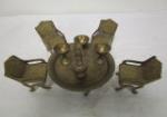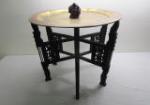 | vintage Middle Eastern or Asian-inspired brass tray table featuring an ornate, removable brass top. And 4-in carved chalkware Buddha painted red. |