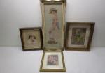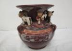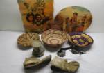 | Collection of native American collectible items/home decor including a 6" piece of Navajo style ceramic pottery, a pair of vintage style suede moccasin boots, a pair of metal dancing Kokopelli candle holders, three woven coiled baskets, an 18-1/2" X 16" and a 15" X 18" resin over wood Native American prints. |
