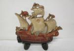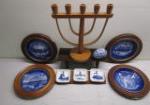 | Wooden Menorah or candelabra, two small wooden shelves, for collectible holiday Royal Copenhagen Christmas plates, blue and white trinket dish in the shape of an egg and three miniature Royal Copenhagen squared display plates. |