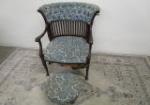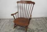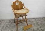 | Antique Lehman "Baby Guard" wooden high chair featuring a distinctive scalloped or shell-shaped backrest and wide wrap around wooden tray. This chair has a Scottie dog decal on the backrest of the chair. |