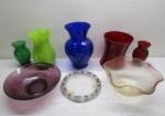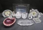 | Gorgeous decorative pink glass ashtray/ bowl with controlled Bubbles and scalloped Edge, Waterford Crystal picture frame, Mikasa and Steger Crystal clocks, Crystal sugar and creamer set with decorative glass bear, candlestick, shakers and small tray. |