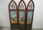 | Gorgeous three-panel folding room divider ( with a Gothic lancet arches design), featuring a beautiful hand-painted decorative landscape mural. The paintings are in a Tromp-l'oeil (trick of the eye) style designed to create the sense that you are looking out windows at the landscape. |