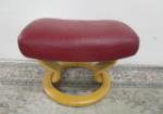 | Stylish Ekornes Stressless style ottoman features a Scandinavian design and red leather upholstery, |