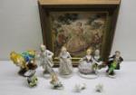 | Porcelain 18th century Court figurines with tapestry framed art and Chinese glazed horse with two poodle figurines and Japanese mini pitcher. |