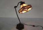 | Tiffany style stained glass table lamp featuring a hexagonal amber glass shade with a metal filigree overlay and a bronze-finish gooseneck base. |