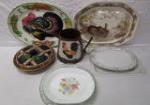 | Collection of bake wear and serving items including six serving platters/dishes, a ceramic blue berry covered pie plate and a 12" metal decorative pitcher featuring a chicken motif. The serving platters/dishes include a 14" XL porcelain platter, a 20" ceramic turkey platter, a Johnson Bros. 21" turkey platter and more. |