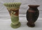 | Pair of vintage vases including a 6" Roseville Pottery vase from the Donatello line and a 5" Roseville "Florentine" vase. |