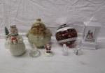 | Collection of holiday decor including a trio of Swarovski crystals figurines from the Christmas "Exquisite Accents" collection (snowman, Santa and tree), two pieces of Lenox (7-1/2" snowman and a glass light up winter scene), a 2" Gorham snowman, a "She Shed" light up ornament, a ceramic snowman and a light up lantern style snow globe. |