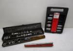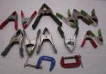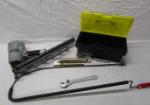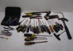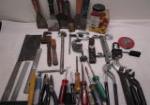 | Hand tool assortment featuring scrapers, wrenches, screwdrivers, channel locks, electric wire caps and vintage ruling tools. |