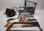 | Electric circular saw with hand saws and miter box. |