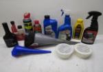 | Assorted automobile fluid with funnels and WD40 Lubricant sprays. |