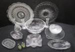 | Gazelle glass salt and pepper shakers with tag and assorted crystal and glass bowls and serving platters with candlesticks, a bell and a swan candy dish. |