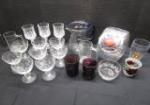 | Vintage glass slanted "penny candy" jar, pair of amethyst glass Tumblers, gorgeous hand blown handpainted water pitcher, assorted vintage stemware, crackled Christmas votive holder and ship etched beer mug. |