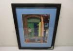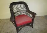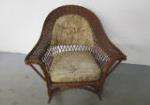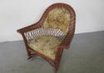 | Antique wicker rocking chair featuring open weave lattice style work, flared arms and a high arched back. This chair has an upholstered back and matching seat cushion. |