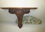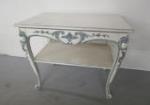 | Lovely French -style console table featuring ornate carvings and curved cabriole legs. This piece has a grey and blue finish with distressed features. |