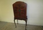 | Stunning vintage Queen Anne style cabinet featuring an arched top, walnut (burl) veneer and cabriole legs. The two doors open to a four section, two drawer storage area. |
