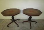 | Pair of Regency-style octagon drum tables featuring a leather style insert, a single pedestal base with four curved legs, curved feet and casters. |