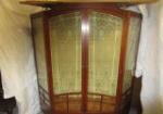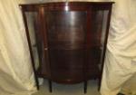 | Beautiful antique curved glass mahogany display/curio cabinet featuring two wooden shelves and a crystal style pull. |