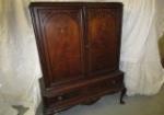 | Beautiful burl wood (veneer front) cabinet featuring a unique design, two large doors opening to three shelves, over a large drawer, gorgeous carvings and accents and lovely hardware. |