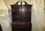 | Stunning Duncan Phyfe Mahogany glass front China cabinet featuring a traditional style, a split pediment top with a center final and arched glass mullions. This piece includes a two-piece construction with a glass-front hutch over one large drawer and a storage cabinet base. |