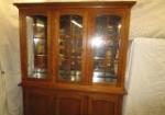 | Absolutely gorgeous antique (possibly walnut) china cabinet featuring a "half moon" shape, beveled glass, brass hardware, three adjustable shelves, locking doors doors and a neoclassic style backing. |