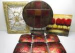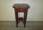 | Adorable French Provincial side table/plant stand featuring a quarter foil shaped top, matching smaller lower level, a deep red surface with hand-painted floral design. |
