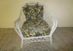 | Darling "Bar Harbor" style white wicker armchair featuring intricate lattice work and floral cushions. |