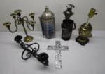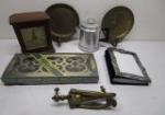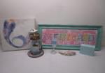 | Collection of very nice metal home decor items including a 22" X 10" "Family" sign, a 7"W X 2"D X 26"H three tier metal mail holder, a 16" X 8" three hook rack, a 12"W X 3"D X 12"H metal "bag" and a 12"W X 12"D X 13"H open top decorative container with a lion motif. |