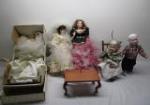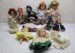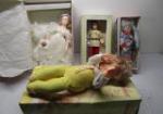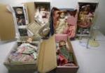 | Large box of vintage dolls including a Madame Alexander Lucy Hayes from the First Ladies of the US Series, a Roseybell Patchwork Princess doll, a Marian Yu Designs porcelain doll and more. |