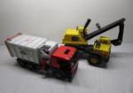 | A vintage Tonka Mighty Diesel Excavator and a Bruder MAN TGS Side Loading Garbage Truck. |