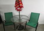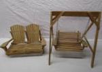| Set of doll size outdoor furniture pieces including a 17" X 13" double Adirondack style chair and a 16" X 21" Adirondack style bench swing. |