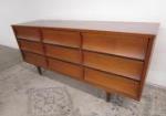 | Lovely mid-century modern nine drawer triple dresser. This piece features a concave drawer front design. |