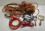 | Assortment of construction/work items including three extension cords, a utility/drop light and two paint brushes. |