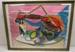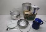 | Red metal enamelware dinner set, service for four includes red handled flatware set and three red-based Boston Red Sox wine glasses. |