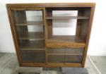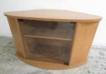 | Interesting blonde wood veneer media cabinet featuring a curved silhouette and glass doors. |