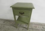 | Country style olive green side table featuring one drawer, a lower shelf and nice hardware. |