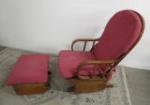 | Sweet Bentwood style glider rocker and matching rocking ottoman featuring a solid wood frame and dark mauve seat and back rest pads. |