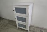 | Adorable three drawer side table featuring a louvered door design and nice hardware. |