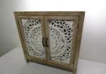 | Gorgeous, new Hobby Lobby brand, white washed ornate wood cabinet featuring two doors with a large hand carved floral medallion pattern. |